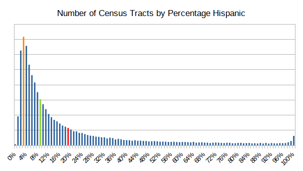 But wait, didn’t I say that the average was 18.73% Hispanic? Doesn’t look like it here. Well, here’s a nice lesson in the difference between average, median, and mode. The national average is 18.73% Hispanic (red line). The median census tract (that is, if you rank them from highest to lowest by percentage Hispanic, it’s the one in the middle) is 8.8% Hispanic (green). And of all of the tracts, the mode (most common) Hispanic percentage is 3% (orange). All different numbers, and all true. Just one of the things that can happen with a skewed (asymmetrical) distribution.