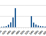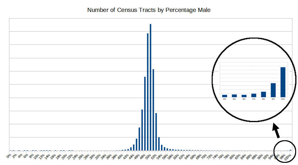A vast majority of census tracts are centered on the midpoint. In fact 85% of census tracts are between 47 and 52 percent male. The extreme outliers are typically correctional facilities (see the right end of the chart, expanded).