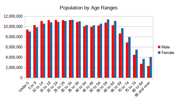 Start with the fact that there are 1.82% more women than men in the US. That gets us 6 million right there. The next thing to consider is age-based, as shown in this chart: